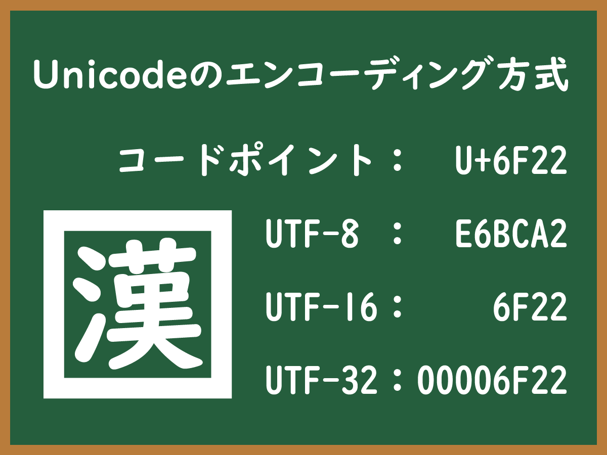 - Unicodeでは文字にそれぞれ固有の識別番号である「コードポイント」(符号位置)を付与しているが、この値をビット列として表現する規則の事を文字符号化方式(符号化スキーム)と呼ぶ。