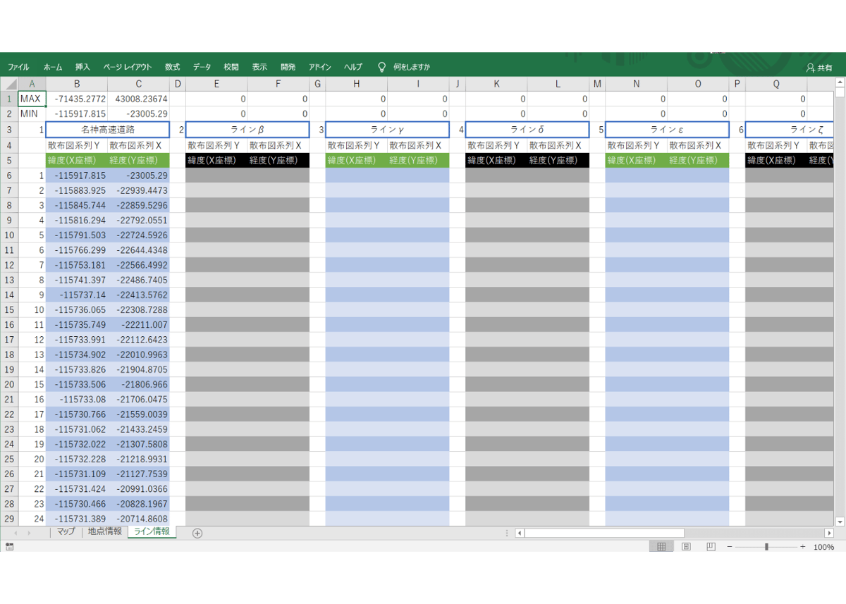 - ライン情報を「1」のグラフ散布図に反映させるための表がある「ライン情報」シート