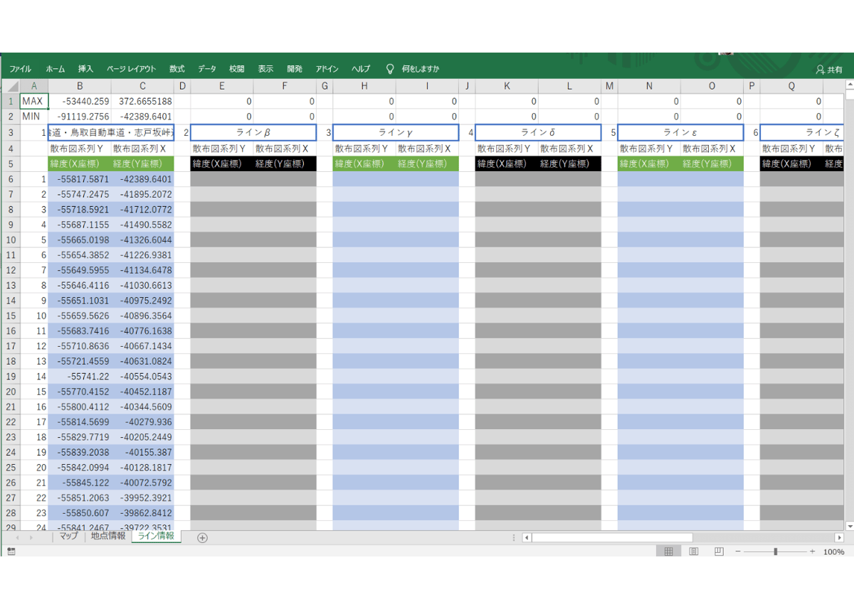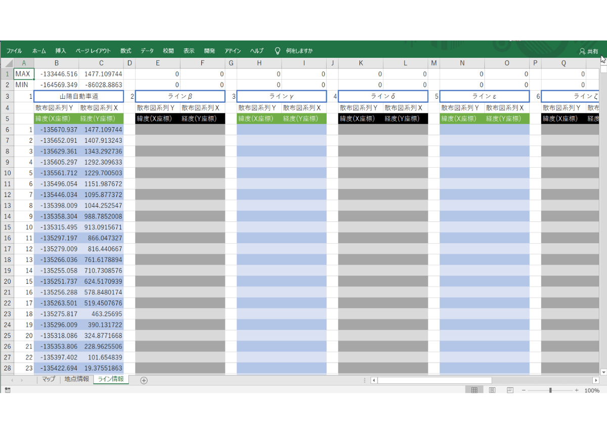 - ライン情報を「1」のグラフ散布図に反映させるための表がある「ライン情報」シート